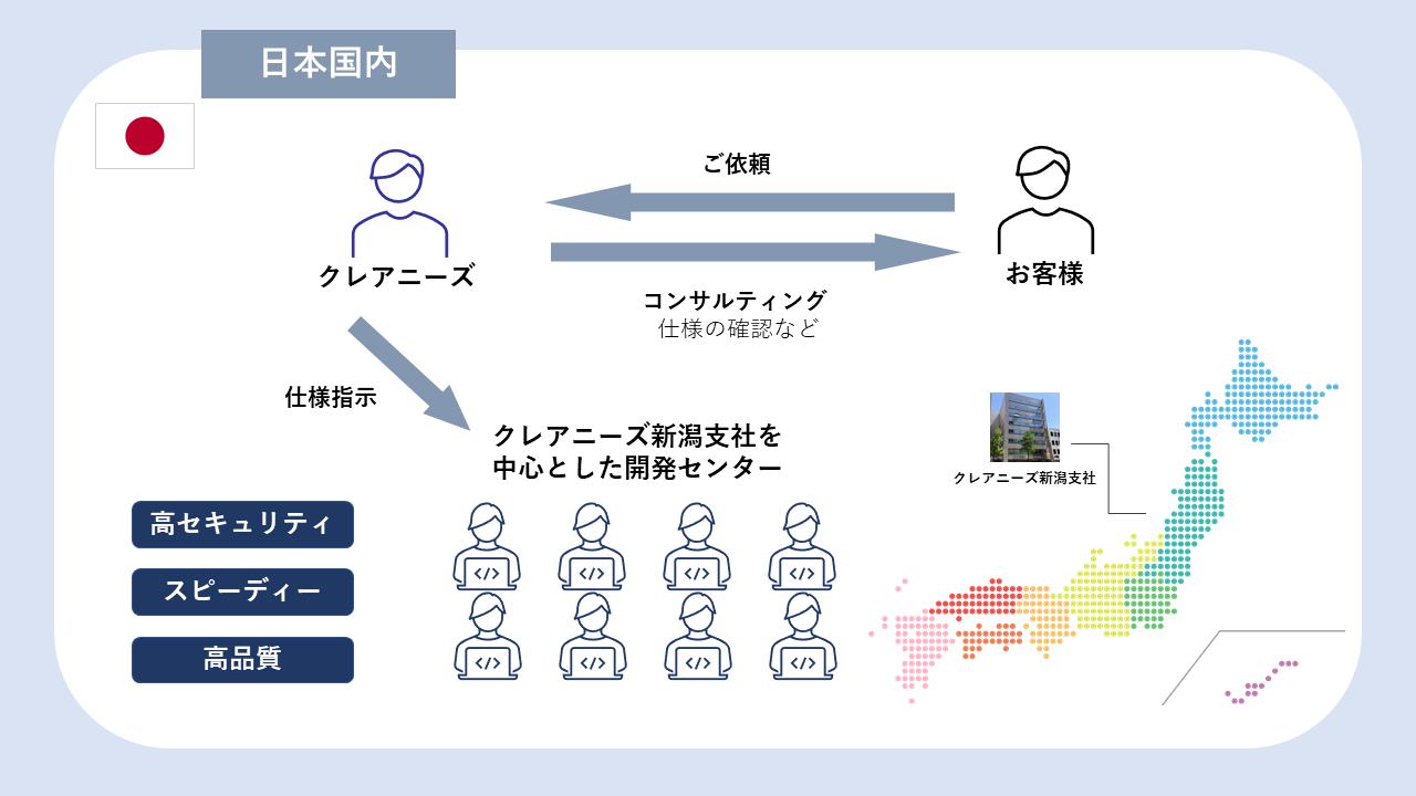 日本国ながらのきめ細かで高品質な開発を実現いたします。また自社の開発なので連携が取りやすく、